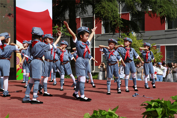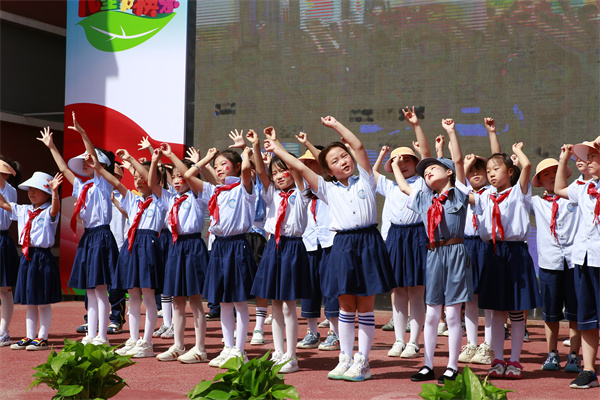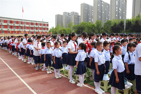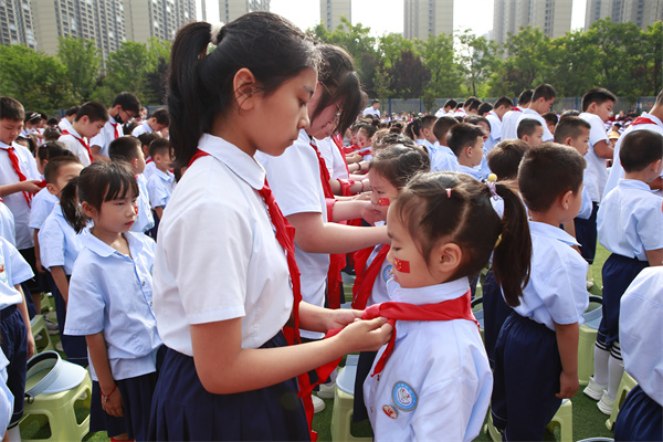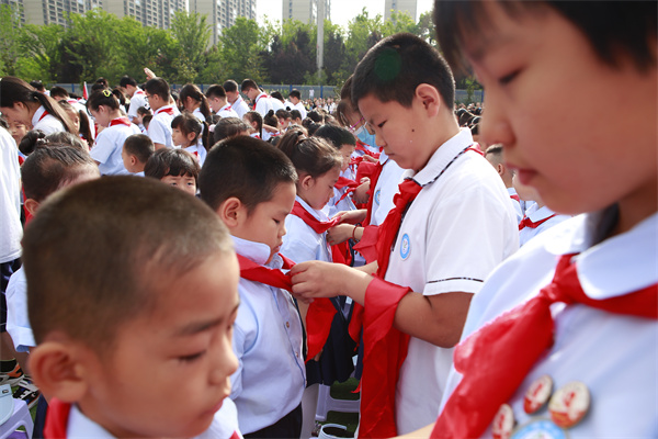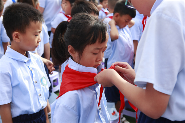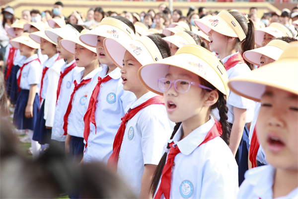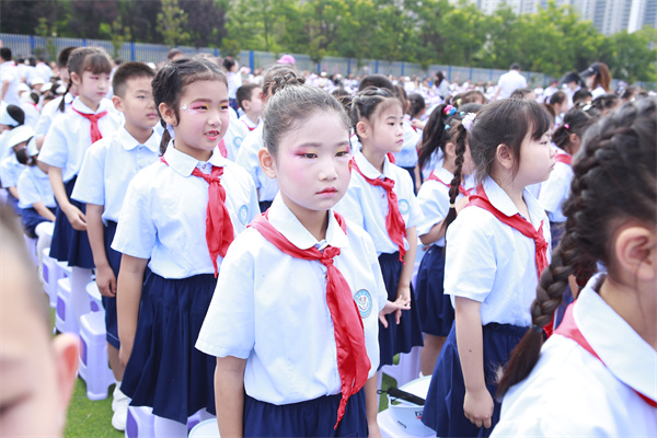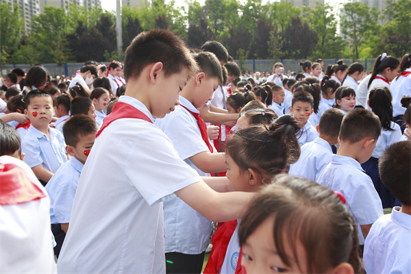 接着,少先队员们为来宾们佩戴红领巾,这一环节既是对传统礼仪的传承,也是对来宾们表示敬意的一种方式。佩戴完红领巾后,少先队员们高举队旗,全场起立,共同唱响队歌。嘹亮的歌声回荡在校园上空,展现了少先队员们的风采和精神面貌。