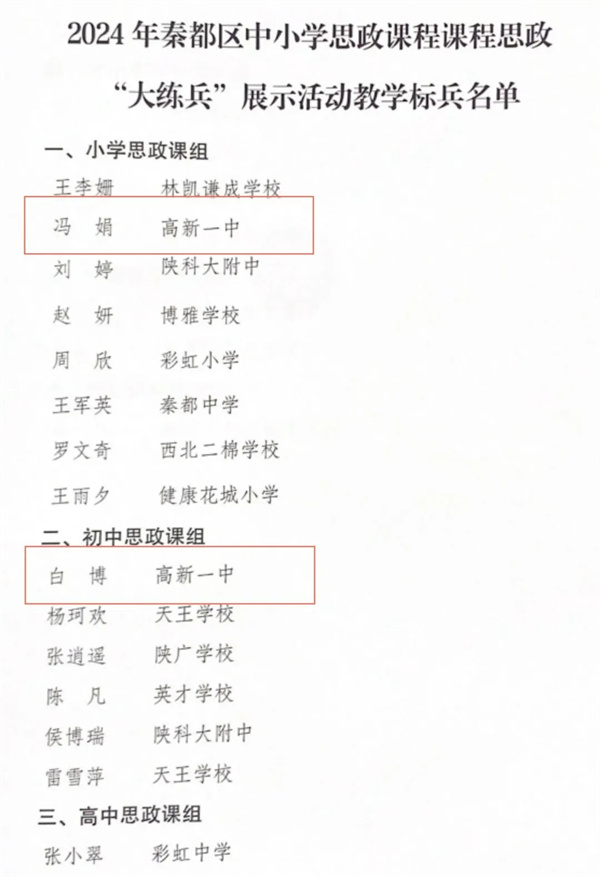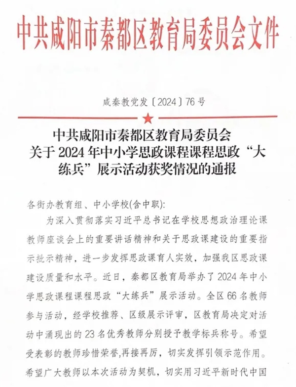 金秋九月,喜报频传。咸阳市高新一中冯娟、白博、孙妍敏3位教师在秦都区教育局举办的2024年中小学思政课程课程思政“大练兵”展示活动中分别荣获“教学标兵”称号。