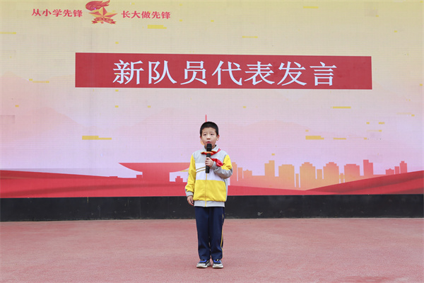 二年级一班段嘉成同学代表新队员上台发言,分享自己加入少先队的喜悦与激动,表达对未来学习生活的美好憧憬和决心,传递出积极向上的正能量。