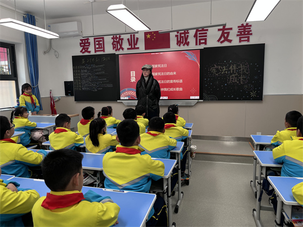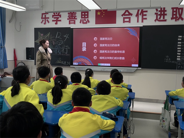 晨会上,全校师生共同观看了宪法知识视频,通过视频中的生动讲解,大家对宪法的基本内容有了更加深入的了解。随后,通过答题互动环节,学生们积极参与,将所学知识转化为实践能力,进一步巩固了宪法知识的学习成果。
