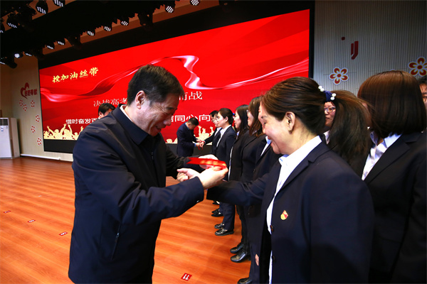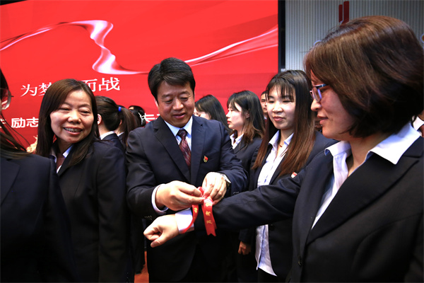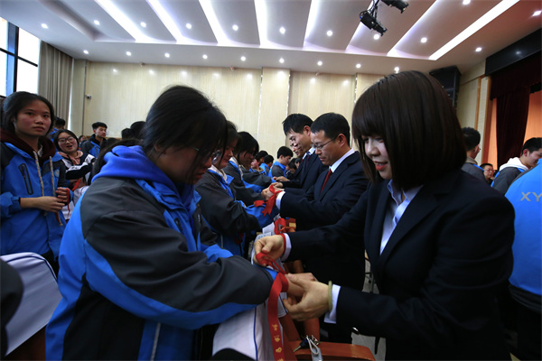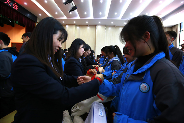 活动尾声,全体高三老师为学生系红丝带,现场气氛热烈,将活动推向高潮。