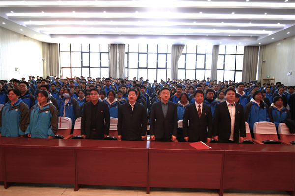 大会在庄严的国歌声中拉开帷幕,全体师生肃立注目,激昂的旋律点燃了每个人的奋斗豪情。