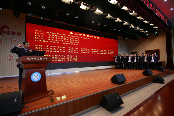 春风浩荡战鼓擂,壮志凌云展雄姿。为激发高三学子迎战高考的昂扬斗志,坚定冲刺信念,2月25日,咸阳市高新一中隆重举行高三百日誓师大会。学校党总支书记于建营、校长刘小云、副校长廖荣、高中部教导主任陈福民、高中部德育主任崔广伟,高三年级全体师生及家长代表齐聚一堂,共同见证了这一振奋人心的时刻。