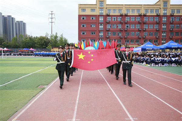 晨光中,运动会开幕式在激昂的进行曲中拉开序幕。国旗护卫队率先登场,旗手们步伐铿锵,护送着鲜艳的五星红旗走过主席台;紧随其后的是校旗队、校徽方阵,蓝白相间的校徽在阳光下熠熠生辉,彰显着“高新精神”的厚重底色。彩旗方阵如虹般掠过,各色旗帜迎风招展,恰似青春画卷上跃动的色彩。