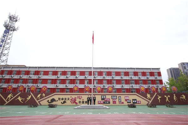 当五星红旗在雄壮的国歌声中冉冉升起,全场师生肃立齐唱国歌,嘹亮歌声回荡在校园上空。