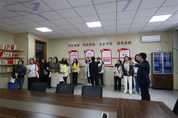 在学校党总支书记于建营的陪同下,代表团开启了校园文化探寻之旅。于书记以“尊重教育”为核心,深入阐释了我校的办学体系、办学理念、文化积淀与发展愿景,使来宾们对我校“高·新”特色的精神内核有了初步而深刻的感知。随后,代表团依次走访了学术中心、思政一体化创新中心、国防教育中心、教师办公室、VR体验室、生涯指导中心及大数据中心。每个空间都彰显着“尊重教育”理念的落地生根,展现着学校在育人模式上的创新探索。