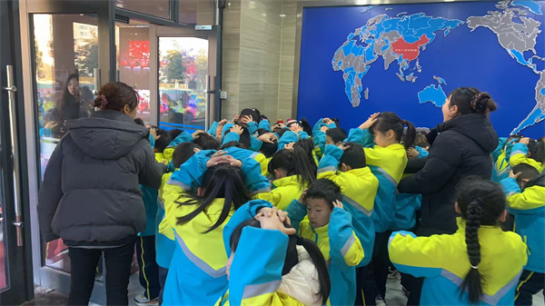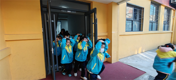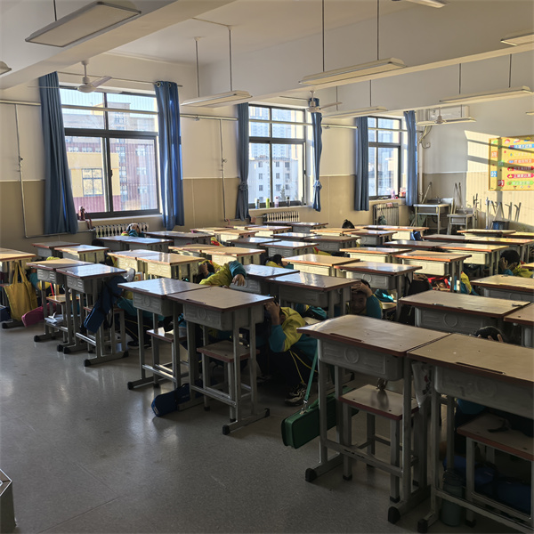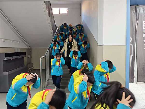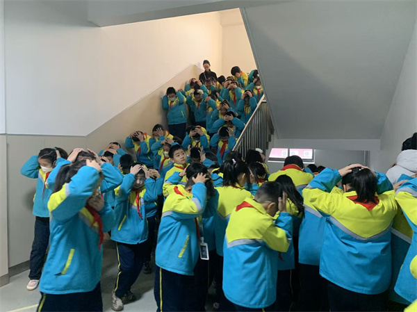 第一声警报响起后,同学们在老师的指挥下,迅速抱头、闭眼,躲在课桌下或墙角边,尽量蜷曲身体,降低身体重心,并利用书本、手臂等护住头部和颈部。老师们在教学楼各层楼梯口,协助处置学生逃生过程中的突发情况,防止发生推挤和踩踏。