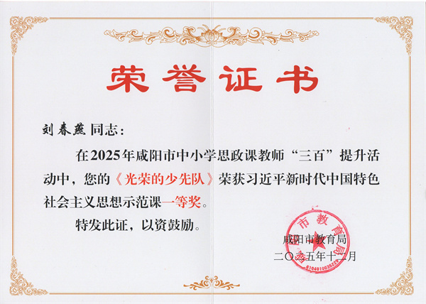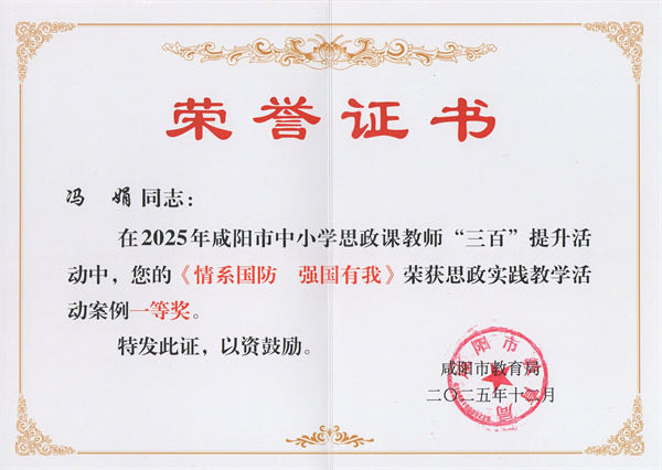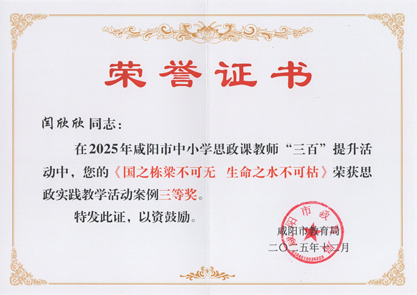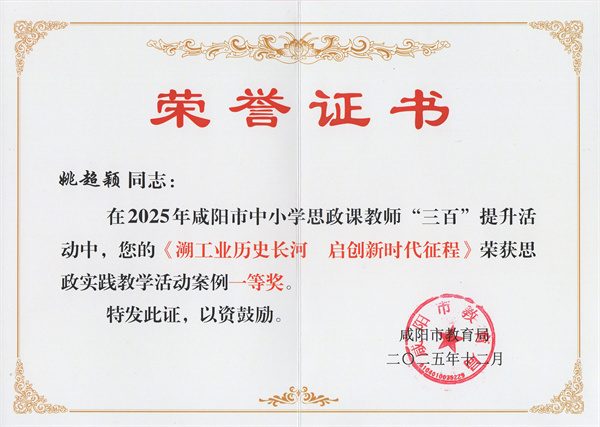 在2025年咸阳市中小学思政课教师“三百”提升活动中,我校教师凭借深厚的专业功底、创新的教学设计与扎实的实践能力,脱颖而出,斩获多项荣誉,充分展现了我校思政课教师队伍的优秀素养与育人风采。
